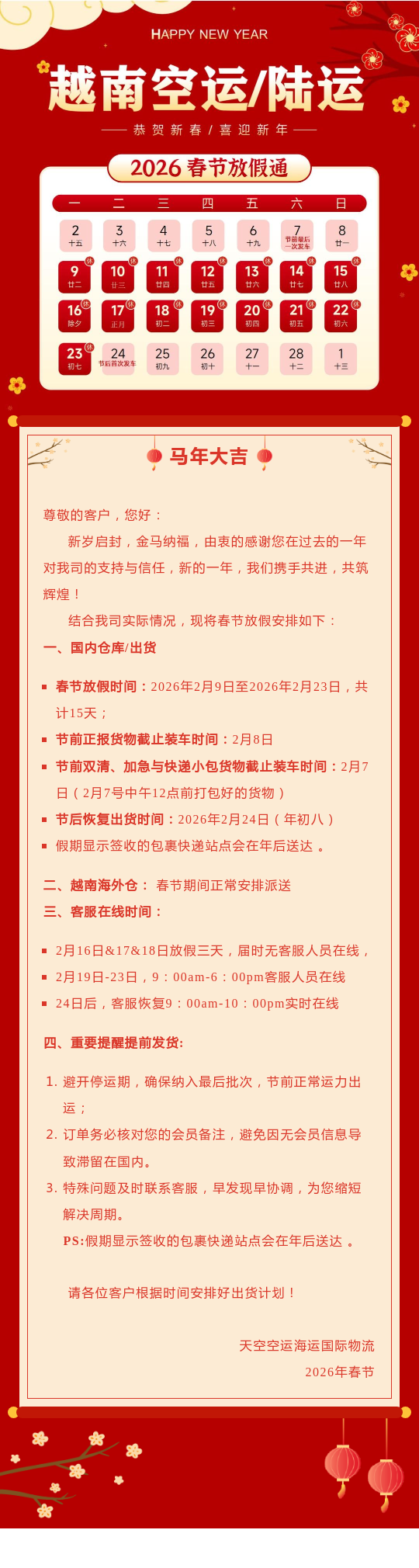 越南陆运/空运 春节假期安排