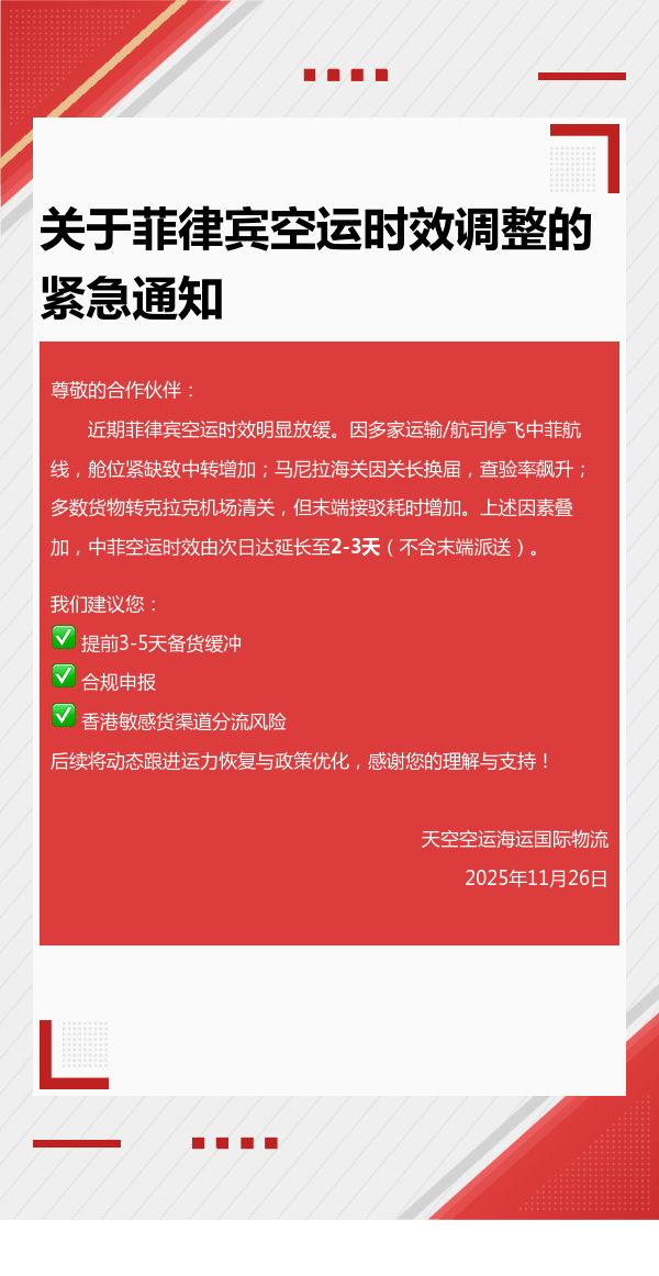 菲律宾空运时效调整通知